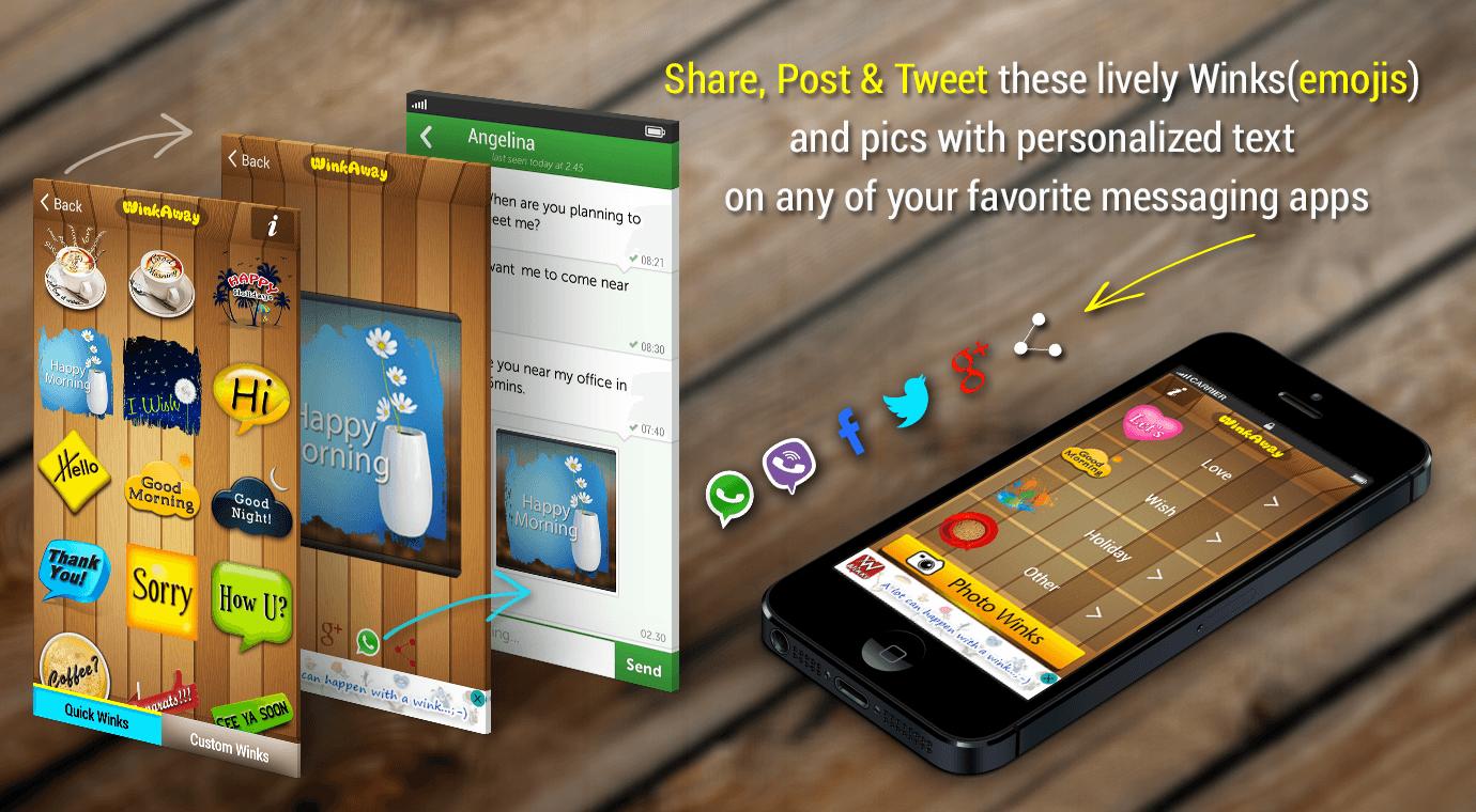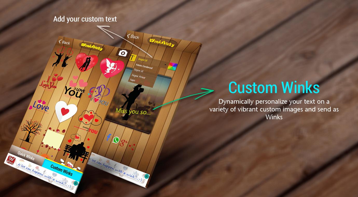 С WinkAway подметает ваш любимый человек с ног с живыми/блаженными/романтическими пожеланиями, используя подмигивание (богатые и выразительные значки с персонализированным текстом) независимо от вашего приложения для текстовых текстов.